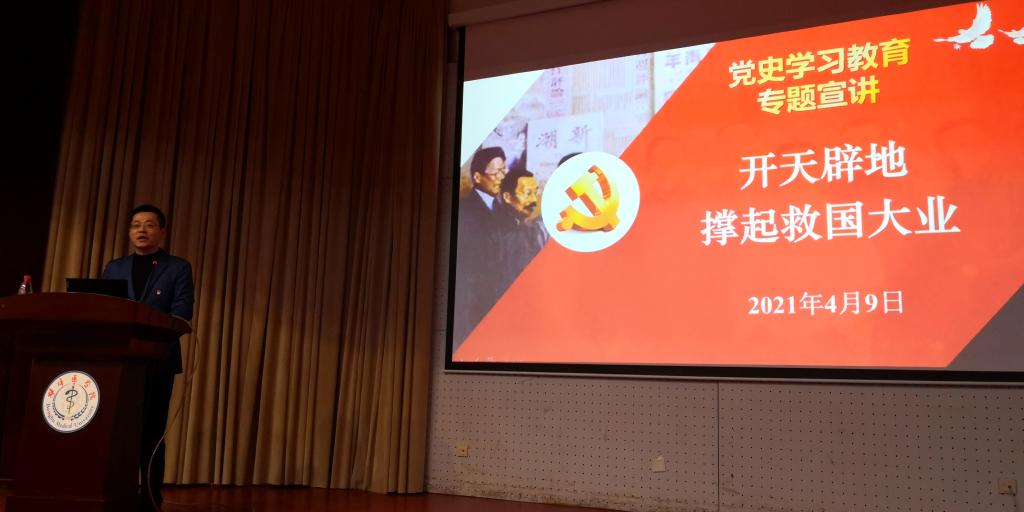 4月9日下午,卫生管理学院、精神卫生学院、马克思主义学院联合举办党史学习教育专题辅导报告会,报告会由马克思主义学院副院长张翮同志做题为“开天辟地撑起救国大业”专题报告。报告会在学术报告厅举行,我院师生党员、入党积极分子和共青团员代表等参加会议。