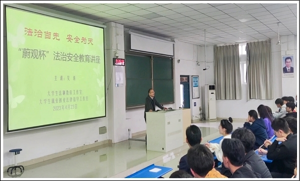 吴涛以“法治当先,安全为天”为题,结合大学生的身心发展特点,从法理基础、法律运用和实际案例出发,围绕与大学生日常生活息息相关的法律问题,有针对性地讲解了《中华人民共和国宪法》、《中华人民共和国刑法》、《中华人民共和国民法典》、《中华人民共和国治安管理处罚法》等法律法规知识,立体、直观地展现了法律的严肃性与权威性。讲座中精彩深入的讲解、生动详实的案例和触目惊心的教训,引发了广大学生的深深思考和强烈共鸣,进一步筑牢了学生学法、懂法、守法、用法的意识与社会责任感。