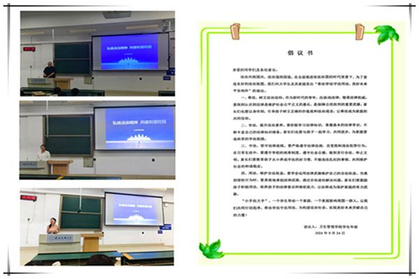 党的二十大报告指出要“努力使尊法学法守法用法在全社会蔚然成风”。国庆假期将至,卫生管理学院向大学生及其家庭发出了“尊法学法守法用法,美好未来平安相伴”的倡议书,呼吁大学生提升法治素养,坚守法律底线,维护合法权益,同时,倡议大学生利用国庆返乡时间,发挥“小手牵大手”作用,形成一个学生带动一个家庭,一个家庭影响周围一群人的宣传效应。
