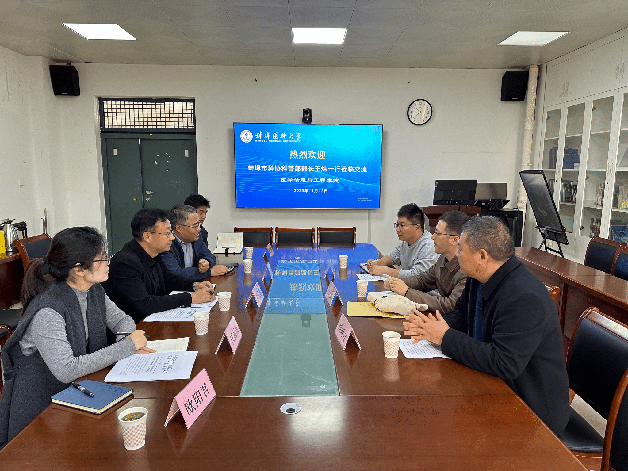 11月12日,蚌埠市科协科普部部长王炜、怀远县科协主席刘明友、怀远一中老师罗家国莅临医学信息与工程学院共商“英才计划”,学院党委副书记贾先果及数理教研室部分教师参加座谈。