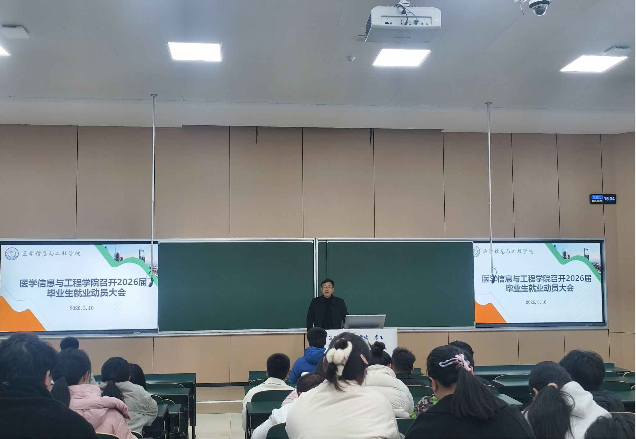 为扎实推进2026届毕业生就业指导与服务工作,引导广大毕业生精准把握就业形势、科学规划职业方向,3月10日,医学信息与工程学院在理论楼T3教室召开2026届毕业生就业动员大会。学院党委副书记贾先果、毕业年级辅导员王俊及2026届全体本科毕业生参会。